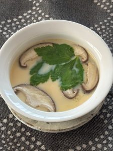 ④器に具材を入れ卵液をかけ三つ葉を飾りラップをする。フライパンに水を張り沸いてきたら器二つを並べ蓋をして、最初は、2分ぐらい中火、それから弱火にして13分蒸す。