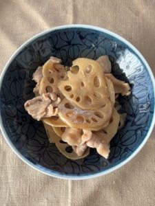 ②そこへレンコンを入れ中火にし、しんなりして来たら煮汁が半分ぐらいになるまで煮詰める。