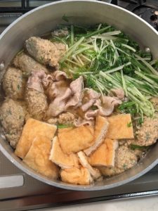 ②鶏ひき肉200gにれんこん一節の半分120gを粗微塵に切る。水菜一わを4〜5cm長さに切る。油揚げ大きなもの一枚を熱湯を回しかけ一口大に切る。豚しゃぶしゃぶ用肉200gは一枚づつほぐしておく。